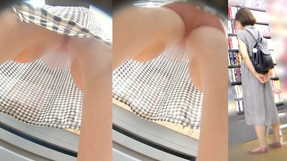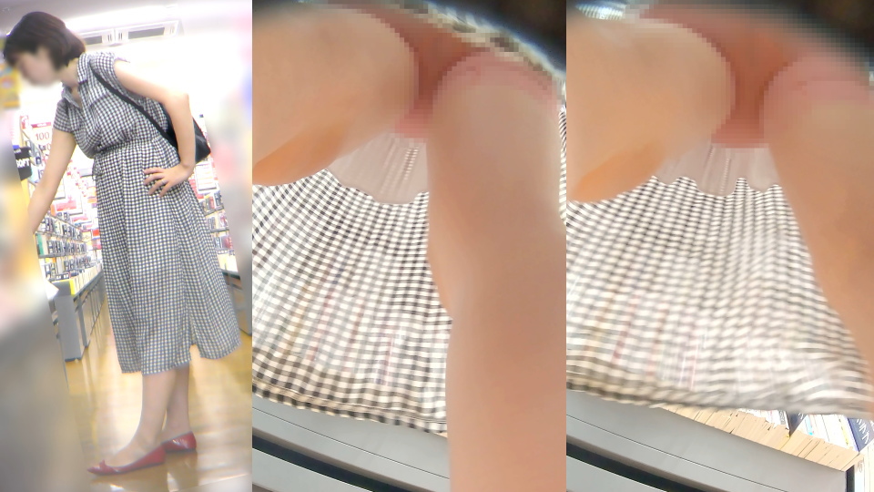 奇抜なファッションでもなく、体型も標準レベル。RPGの村人Aみたいに、どこにでもいるような主婦のパンチラです。時間を持て余した主婦の特権なのか、商品をじっくり吟味してますね。